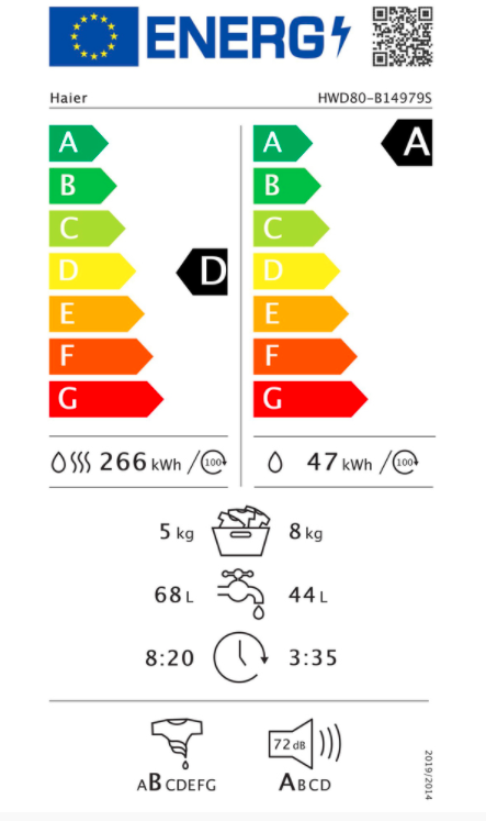 Pračka se sušičkou Kapacita bavlna 8+5 kg Maximální otáčky odstřeďování 1400ot/min. Energetická třída D Třída účinnosti odstřeďování B Spotřeba energie praní 47 kWh/100 cyklů ...Více informací